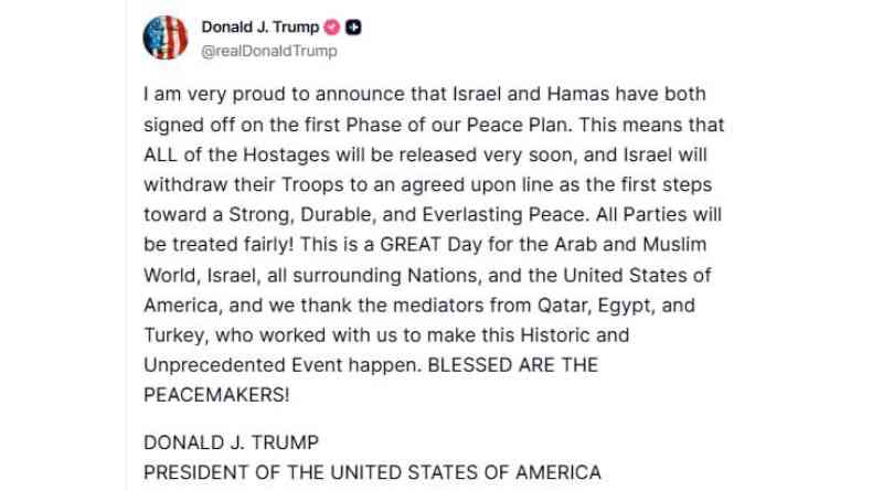 Read MoreTrump anuncia que as partes chegaram a um acordo de cessar-fogo em Gaza e que os reféns serão libertados em