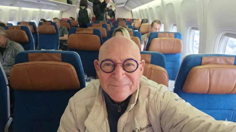 Imagem, foto no embarque a caminho de Israel, original vertical alterada para horizontal e expandida para as laterais por IA.